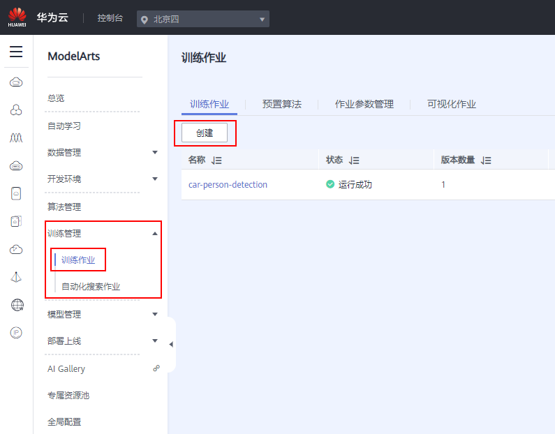 在训练作业列表中,单击左上角“创建”,进入“创建训练作业”页面。