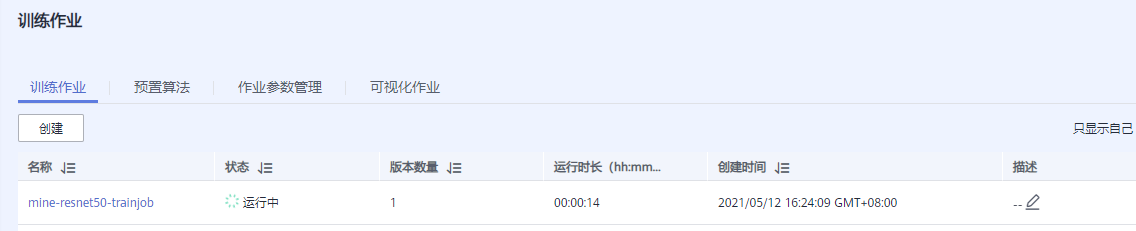 配置完之后,点击下一步 -> 提交 -> 返回训练作业列表,可以看到训练作业 mine-resnet50-trainjob 正在运行:
