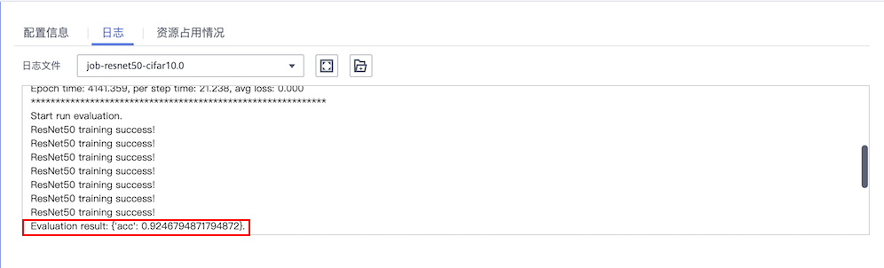 最后,点击训练作业 mine-resnet50-trainjob,在日志里可以看到模型在测试集上的准确率为 92.47%,说明该模型效果不错。