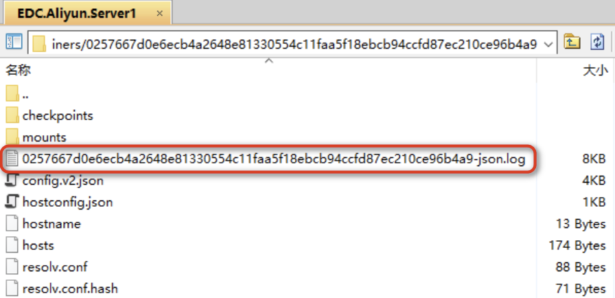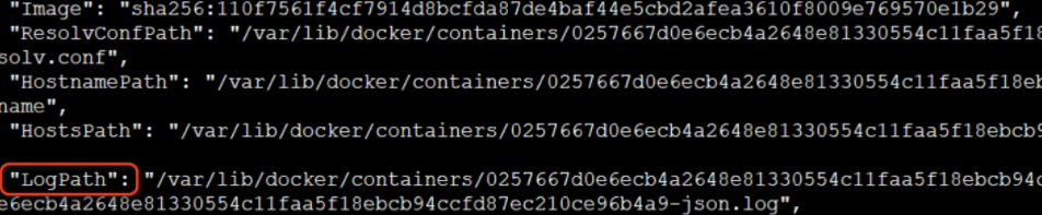 通过inspect命令,可以查到该容器的ID及一系列配置信息,我们重点关注LogPath即可: