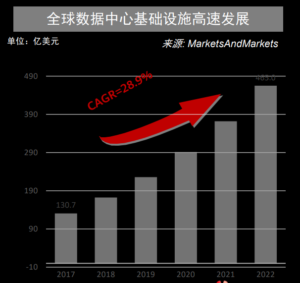 数据流量的极速增长,加上政府对各新兴产业的大力扶持,数据中心的发展建设将迎来高速发展时期,根据MarketsAndMarkets的数据统计预估,全球数据中心的价值将从2017年的130.7亿美元增长到2022年465.0亿美元(见图2),这其中的CAGR(Compound Annual Growth Rate,复合年均增长率)高达28.9%。其市场规模及市场价值,不言而喻。