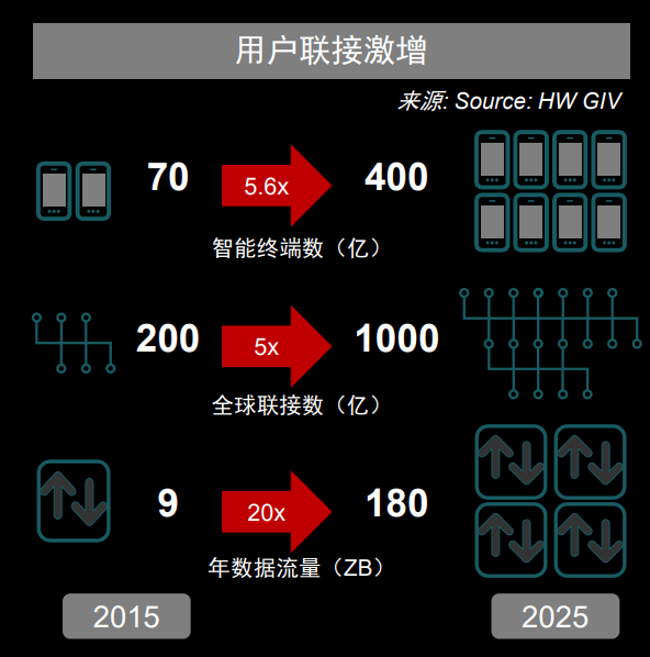 现如今,我们已经处在一个全联接的世界。从2015年到2025年,根据华为GIV的数据预测,全球智能终端联接数将从70亿激增到400亿,全球联接数也将从200亿激增到1000亿。而在硬件数和联接数激增的背后,是数据流量的爆发式增长:年数据流量将从9ZB以20倍的速度涌至180ZB(见图1)。