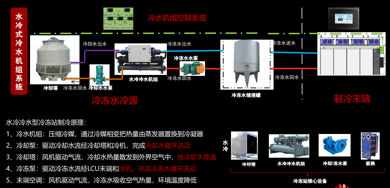 整个系统可以分为冷冻站和末端机房两部分,这边虚线的左侧是冷冻站,它包括冷却塔,制冷机组,各种功能的水泵以及储存冷水使用的蓄冷罐;虚线右侧则是我们的IT设备机房,里面除了服务器机柜外,还要用来吹出冷风的空调。空调的冷源即来自于左侧的冷冻站。