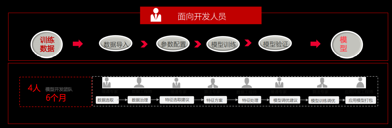 普通的建模(如下图),针对开发人员:从节能建模到模型应用,需要开发人员4个,历时6个月。
