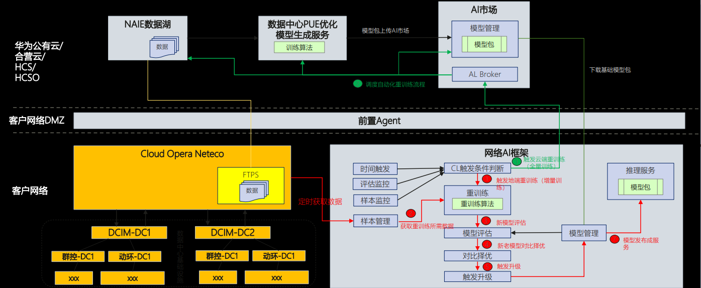 NAIE的云地协同,在云上有NAIE的数据湖、数据中心PUE优化模型生成服务,以及AI市场(AI市场用来管理生成的模型包);在客户网络的地端,有网络AI框架(运行模型生成服务生成的模型的平台)。地端的网络AI框架负责样本采集及管理,同时还负责运用新的样本不断地对生成的模型进行评估。如果发现采集的样本的分布发生了明显的变化,或者说是模型精度老是不达标的时候,就会触发去重建模型。