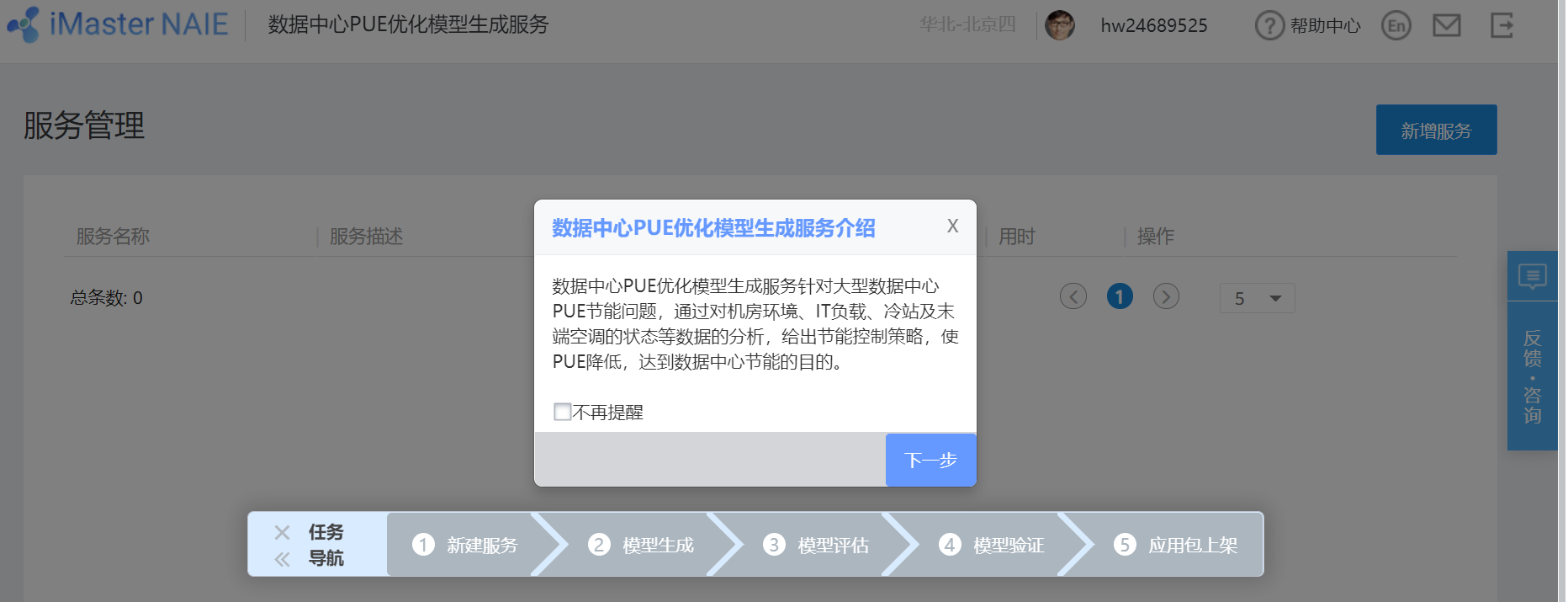 进入服务介绍页面,根据指导一步步往下走,即快速便捷体验数据中心PUE优化模型生成服务。