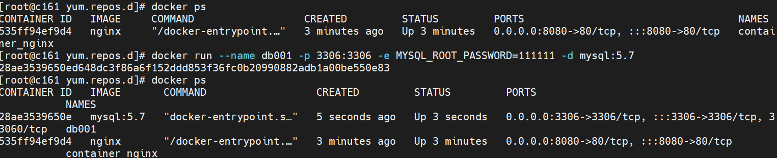 #查看已经运行的的所有容器,启动mysql的docker容器,容器名字叫:db001,mysql的root用户密码是:mytest,映射宿主机子的端口3306到容器的端口3306,仓库名mysql和标签(tag)唯一确定了要指定的镜像,其实如果这里只有一个mysql也有必要要tag