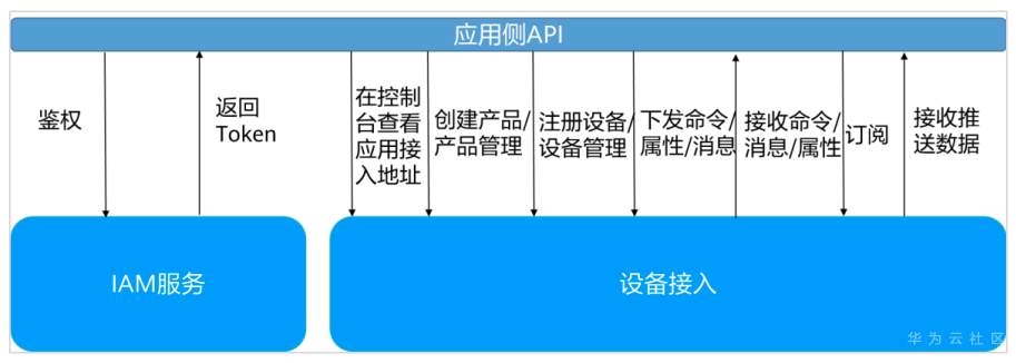 应用侧需先通过 IAM 服务鉴权,获取 Token 后,方可实现相关产品管理、设备管理等功能。