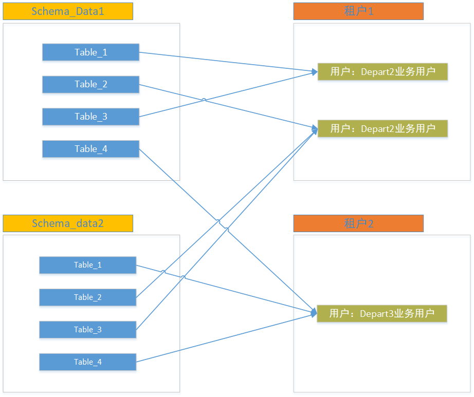 当前的存储资源管理方式存在着schema与用户多对多的关系,这使得存储资源的管理变得复杂。例如,XXX平台拥有Schema1_data和Schema2_data两个schema;XXX平台有Depart1业务用户,Depart2业务用户和Depart3业务用户三类用户且这三类用户绑定了两个租户。