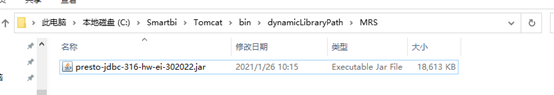 步骤1:进入smartbi安装目录C:\Smartbi\Tomcat\bin\dynamicLibraryPath,新建驱动存放路径,例如MRS,并将hetu的JDBC驱动放置于该目录下,如下图所示