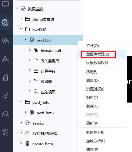 步骤7:选择步骤6中添加的数据名称,右键选择“数据库管理”