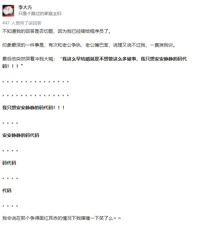技术钻研的态度值得学习,但是选择的时机就不合适了。谈起“单纯耿直“这一挂的程序员男友,下面这位吵架时心里还想着码代码的程序员老公,也是既可气又可爱了。