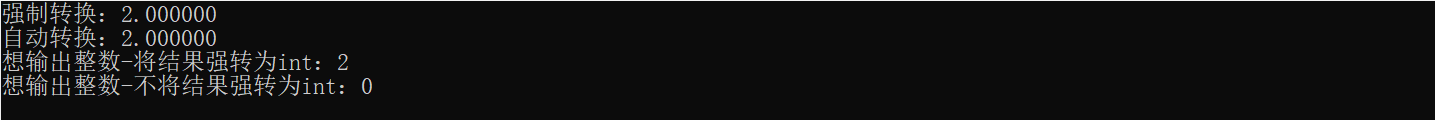 printf("想输出整数-将结果强转为int:%d\n",(int)sqrt((double)4)); //将double型结果强转为int型