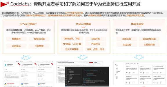 为了让开发者快速掌握华为云服务和进行应用开发,Codelabs网罗了鲲鹏计算、IoT物联网、AI、云计算等多个领域的230+场景/代码示例,支持代码示例工程一键式下载,支持在线调试和运行,方便开发者直接参考和借鉴。