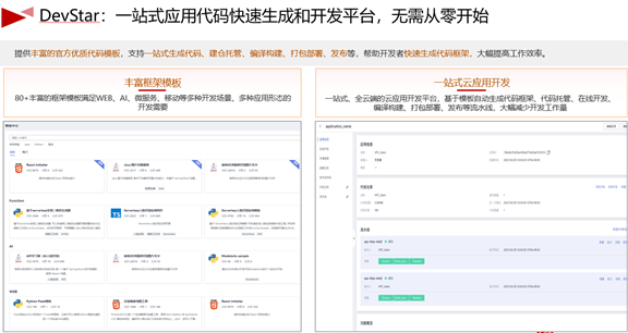 DevStar是针对开发者的应用开发痛点,提供了Web、App、微服务、AI、Serverless等不同类型的80+通用框架模板,让开发者无需从零开始开发应用。