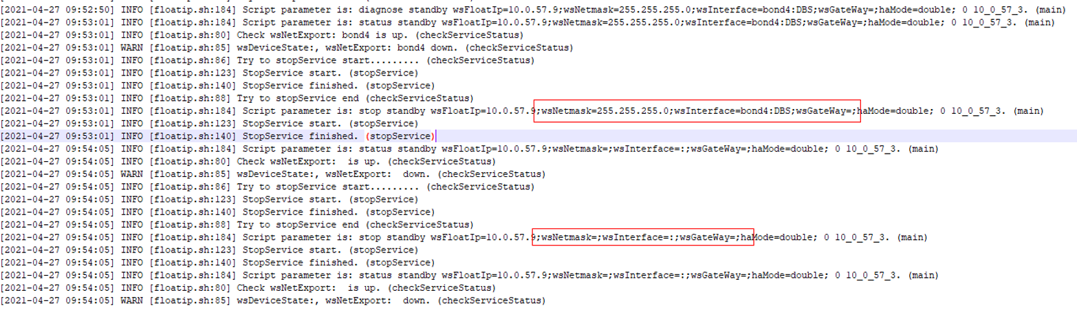 3、查看进程检查日志log,发现浮动ip异常,如下所示: