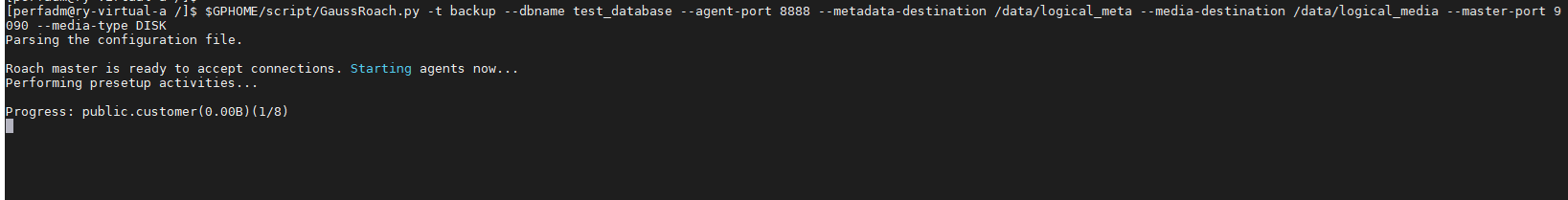 $GPHOME/script/GaussRoach.py -t backup --dbname test_database --agent-port 8888 --metadata-destination /data/logical_meta --media-destination /data/logical_media --master-port 9090 --media-type DISK