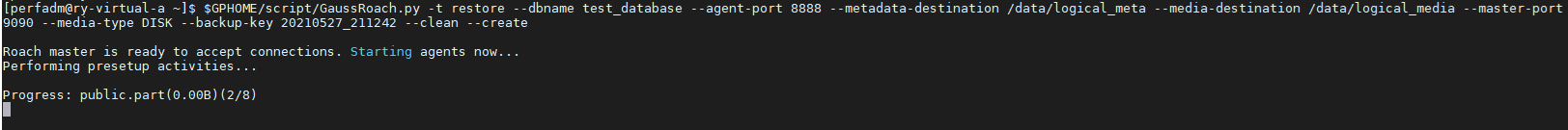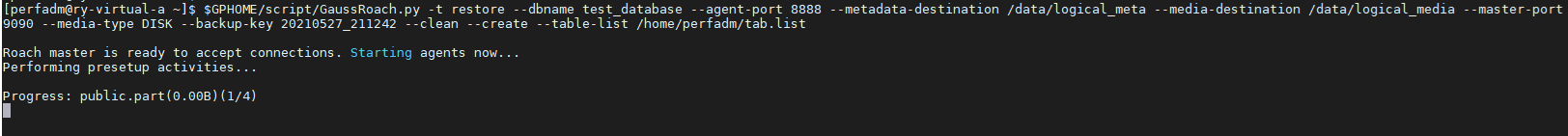 $GPHOME/script/GaussRoach.py -t restore --dbname test_database --agent-port 8888 --metadata-destination /data/logical_meta --media-destination /data/logical_media --master-port 9090 --media-type DISK --backup-key 20210527_211242 --clean --create --table-list /home/perfadm/tab.list