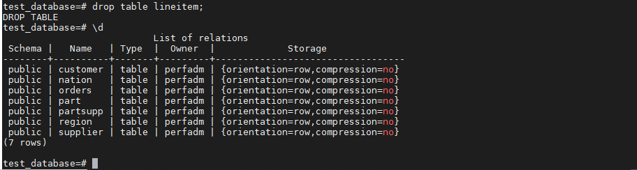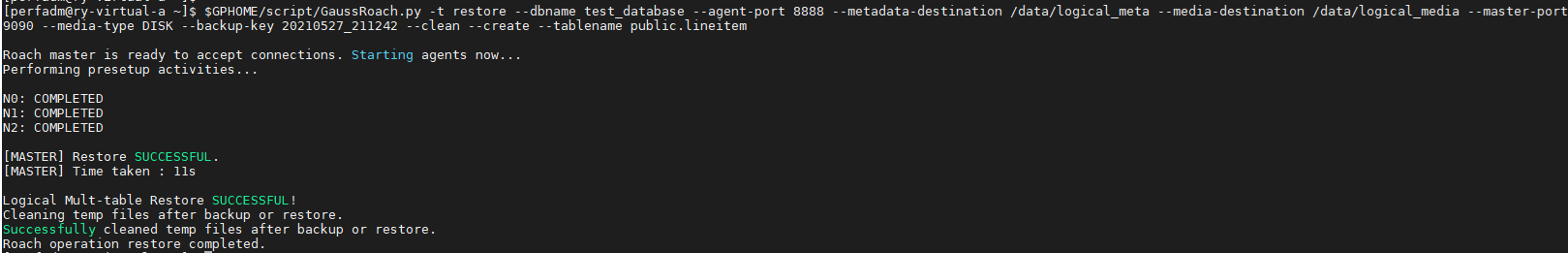 $GPHOME/script/GaussRoach.py -t restore --dbname test_database --agent-port 8888 --metadata-destination /data/logical_meta --media-destination /data/logical_media --master-port 9090 --media-type DISK --backup-key 20210527_211242 --clean --create --tablename public.lineitem