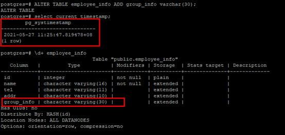 | --向表中增加一个varchar列group_info。 ALTER TABLE employee_info ADD group_info varchar(30); --查看当前系统时间。 select current_timestamp; |