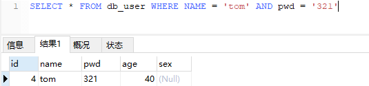 SELECT * FROM db_user WHERE name = 'tom' AND pwd = '321'