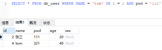 SELECT * FROM db_user WHERE name = 'tom' OR 1 = 1 AND pwd = '111'