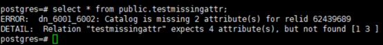 问题现象:在cn5001上查询select * from public.testmissingattr时报错:dn_6001_6002: Catalog is missing 2 attribute(s) for relid 62439689