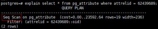 3.由于系统表的查询都是优先从syscache中扫描,而syscache都是带索引扫描,因此我们需要将索引关掉,再查询一遍,来确认是仅有索引中缺少这两条记录,还是pg_attribute中确实缺少这两条记录。