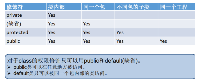 1 4种权限修饰符:private (私有)、public(默认)、缺省、protected
