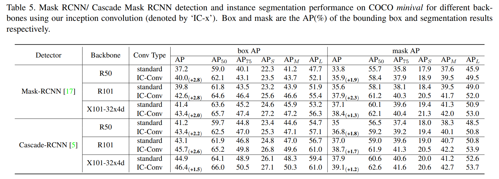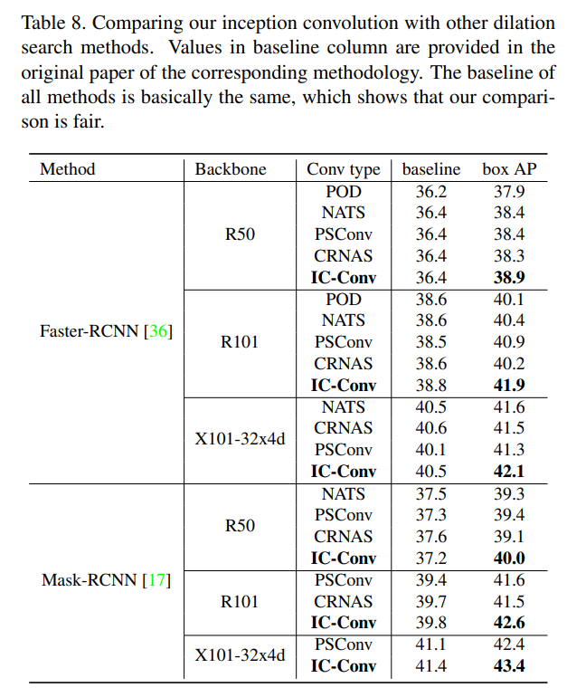 实证结果表明,本文方法在广泛的Baseline测试中获得了一致的性能提升。例如,通过简单地将ResNet-50主干中的3x3标准卷积替换为Inception Conv,将Faster-RCNN在MS-COCO上的mAP从36.4%提高到39.2%。此外,在ResNet-101骨干网中使用相同的替代方法,在自下而上的人体姿势估计上将AP得分从COCO val2017的AP得分从60.2%大幅提高到68.5%。