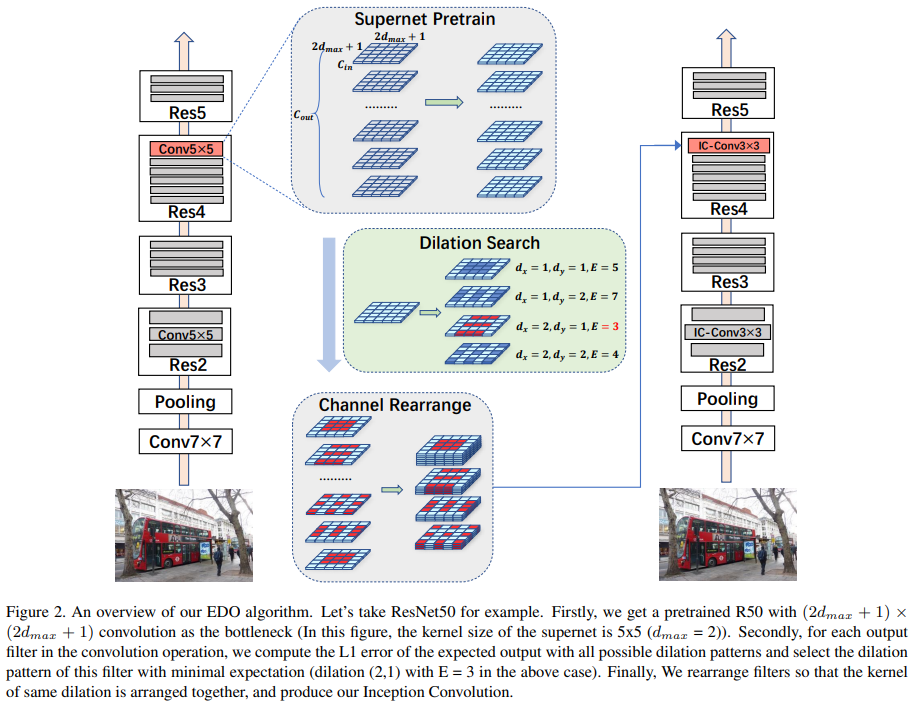 Incetption 卷积提供了一个密集可能的ERF范围,该文提供了一种高效的膨胀优化算法(EOD),其中超网络的每层都是一个标准的卷积操作,该卷积包含了所有可能的膨胀模式。对每一层的选择,通过最小化原始卷积层和与所选膨胀模式的卷积的期望误差,使用一个预训练的权值解决选择问题。具体流程如下图所示: