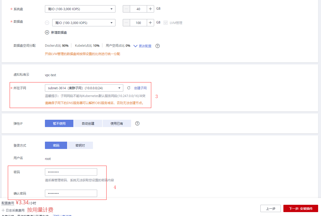 完成相关配置后,点击创建节点按钮进入节点创建页面,其中可以选择目标节点规格,根据预估实际使用量来挑选合适的节点规格,并且在集群登录方式上可以选择密码和密钥对两种方式。