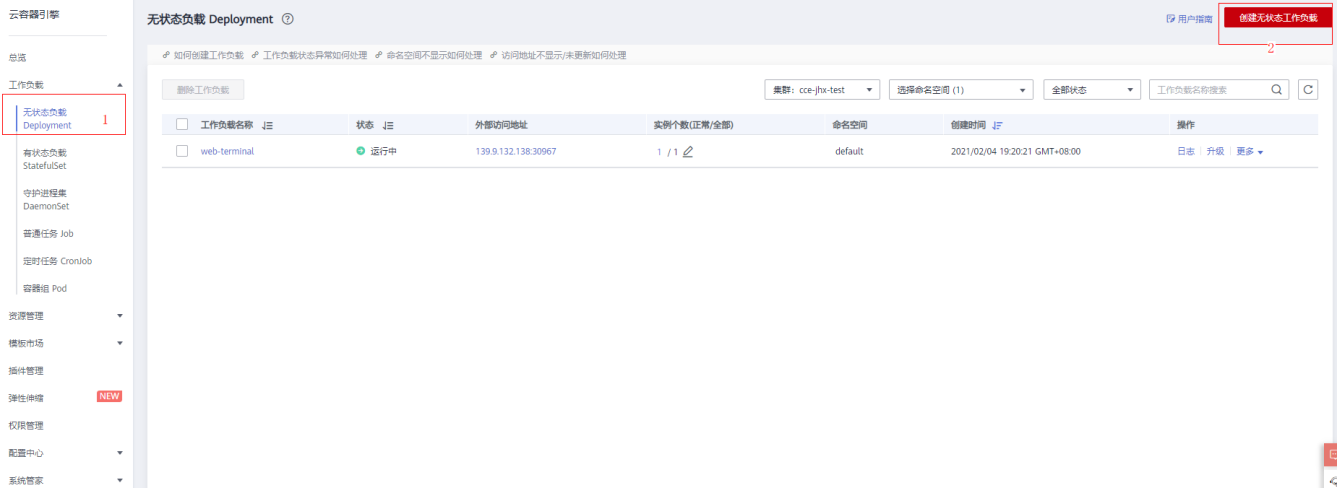 - 在CCE左侧导航栏中单击“工作负载>无状态负载Deployment”,单击页面右上角的“创建无状态工作负载”。