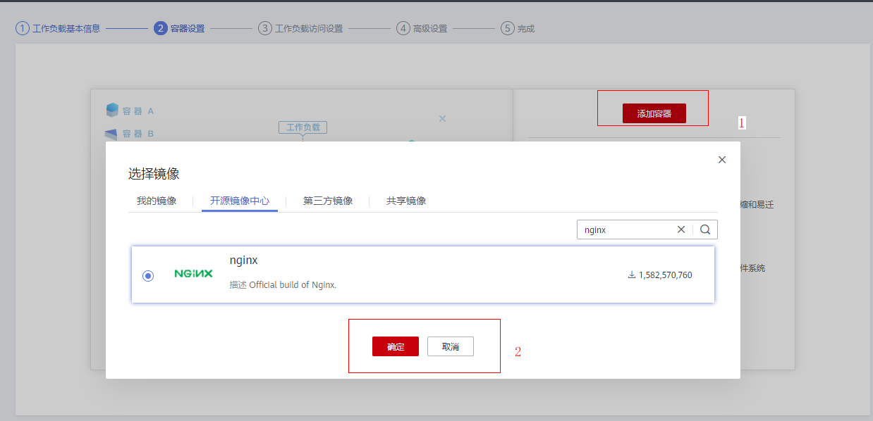 - 在容器设置页面,点击添加容器。其中在选择镜像时,可以选择开源镜像,若开源镜像中不满足实际需求,可以自行制作第三方镜像,并在该页面中选择制作好的镜像。