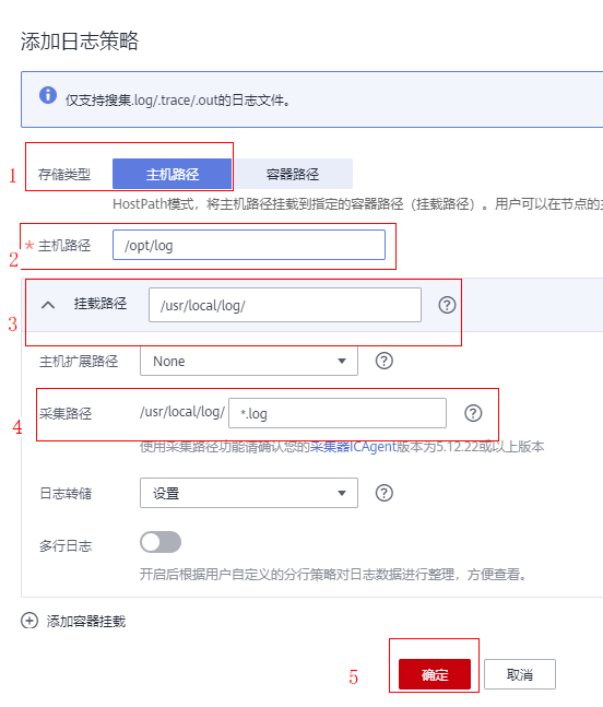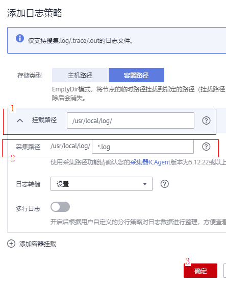 - 进行容器日志配置。选择容器日志,点击添加日志策略,在此处设置容器日志的存储路径,这里提供了两种日志收集策略,分别是添加主机路径及容器路径。主机路径(HostPath)的方式将主机路径挂载到指定的容器路径中,用户可以在节点的主机路径中查看到容器输出在挂载路径中的日志信息。选择容器路径,则是采用emptyDir的方式,将节点的临时路径挂载到指定的路径下,无需额外指定节点日志路径。一般情况下,推荐采用容器路径方式进行部署。