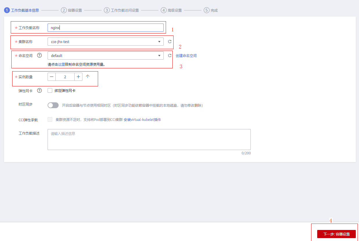 - 在弹出的界面中,输入想要创建的deployment名字及所属集群名。这里以nginx为例,选择工作负载名称为nginx,并选择该负载所属集群名称,然后选择好部署的命名空间,选择实例数量后,点击容器配置。
