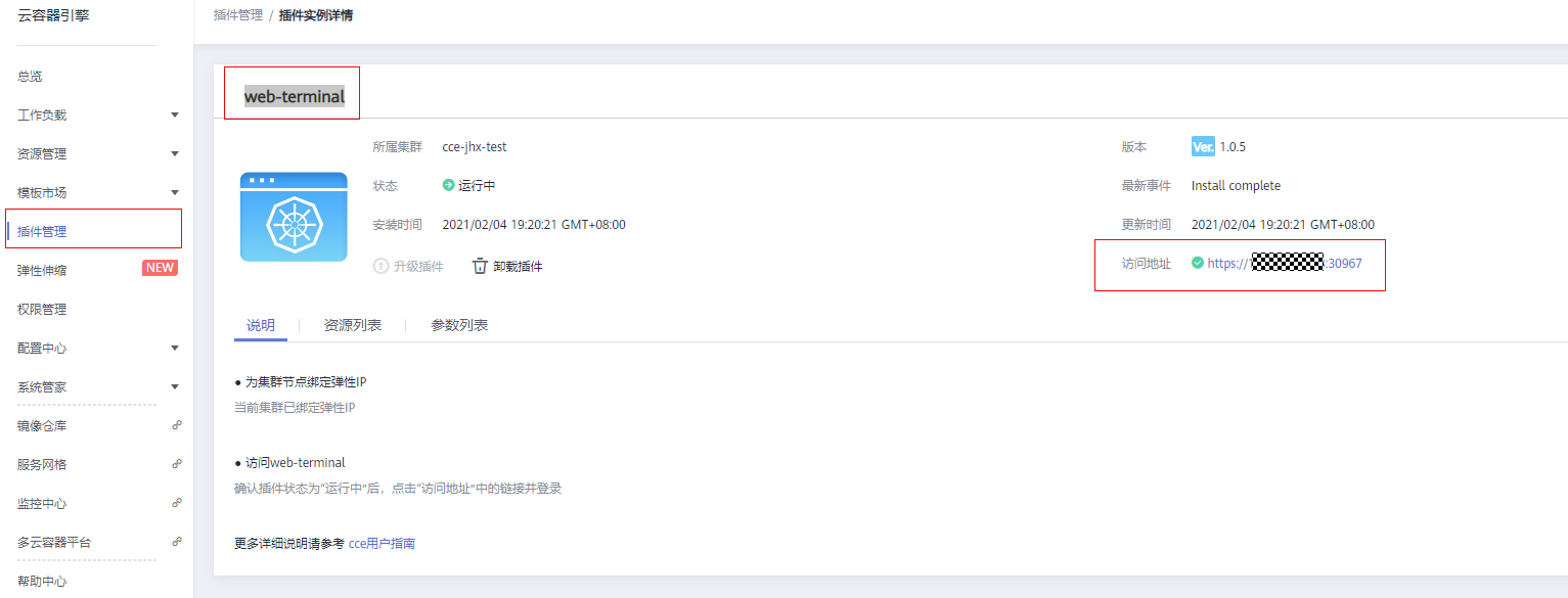 在首次点击web-terminal时会提示需要安装web-terminal插件。按照提示完成相应插件安装,值得注意的是需要为web-terminal绑定弹性IP用于外部连接。