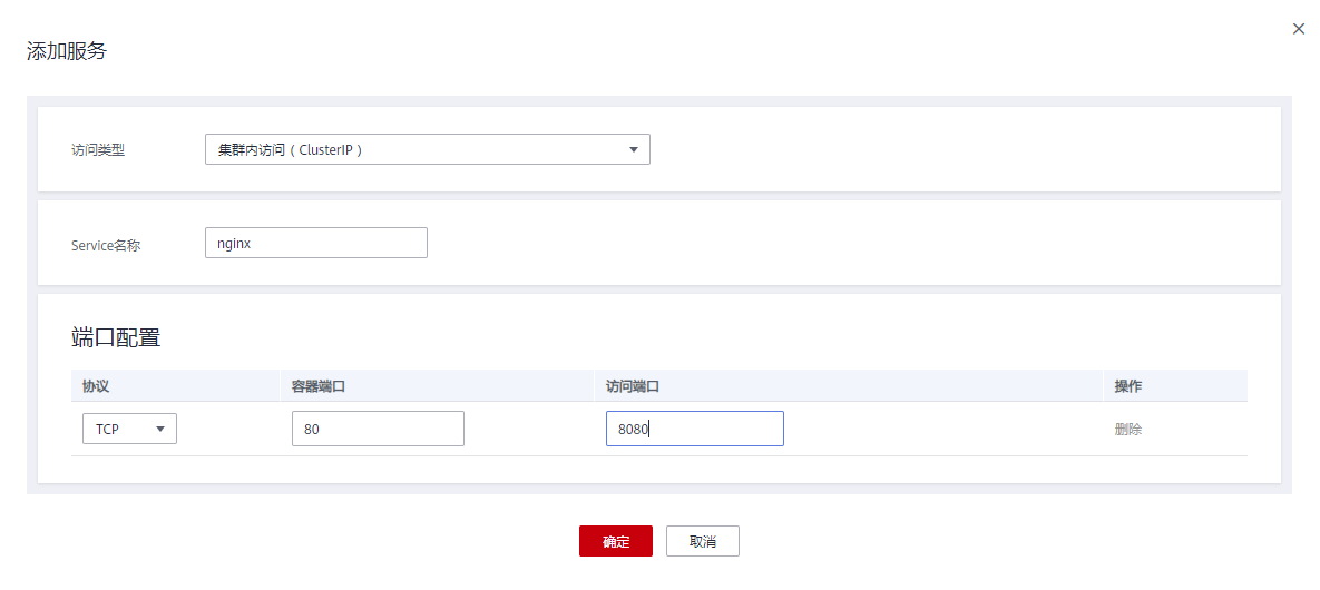 - 选择确定后,按照标准步骤,执行工作负载访问设置,点击添加服务,在本例中,采用nginx服务作为部署案例,容器端口为80,在端口配置中进行配置即可。