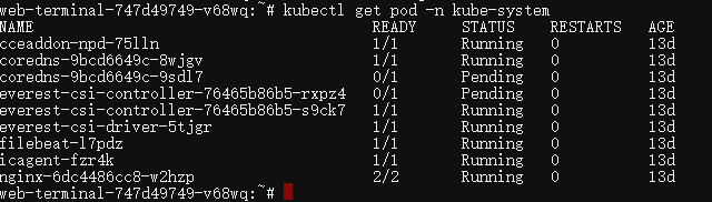 同时在web-terminal通过命令kubectl get pod –n {namespace}来查看容器部署情况,示例如下: