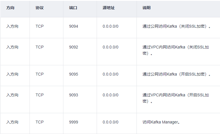 确保存在可用的安全组,创建方法,请参考创建安全组。如果您已有安全组,可重复使用,不需要多次创建。使用kafka服务时,必须放通以下安全组规则,其他规则请根据实际需要添加。