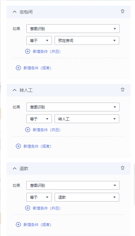KTV场景包含多个场景:预定包间、取消预订、退款、转人工等,因此对话开始设置条件节点,通过用户的输入判断意图,通过设置不同的分支实现各自的处理逻辑。