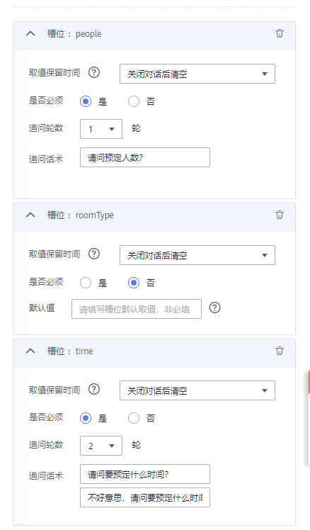例如用户想要预定包间,此处需要收集用户预定人数、预定时间、预定房型相关信息,其中房型可设置为非必须槽,后续可根据预定人数进行计算: