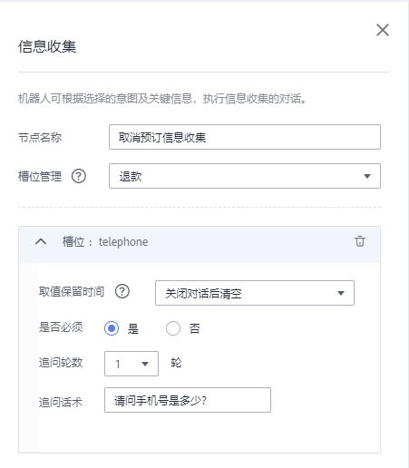 例如用户需要取消预约订单,则需要收集预定的信息,例如联系电话: