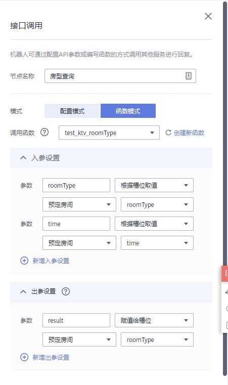 接口调用节点支持两种模式:配置模式、函数模式。配置模式可以对接用户后台接口,支持多种请求方式,入参可设置多种来源(槽位值、自定义固定值、全局变量),出参支持多级Json格式读取,赋值给槽位或全局变量。通过接口调用对接客户后台接口,可执行数据库查询、信息更新等操作,完成信息闭环。函数模式使用华为云函数工作流服务,可自定义入参、出参,用户可以在函数中自定义各种逻辑操作,实现数据标准化、信息查询等其他功能。