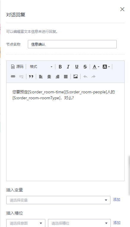 在KTV场景中,若已确定预定房型、预定时间并且有空余房间,则可通过对话回复节点向客户确认预定信息,其中插入之前获取槽位信息: