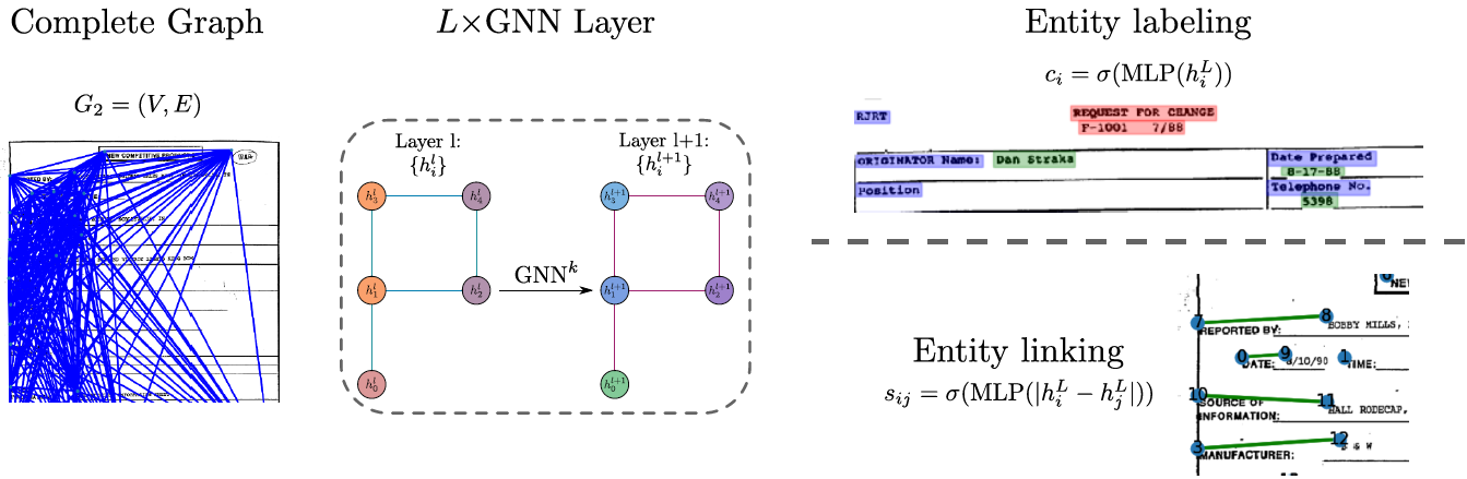 GNN被广泛应用于NER和表格提取等任务中,本次解读的文章在此基础上提出将GNN应用于提取key-value对的任务中,不仅对文档图片中的实体进行分类,而且还会对实体间的关系进行预测。