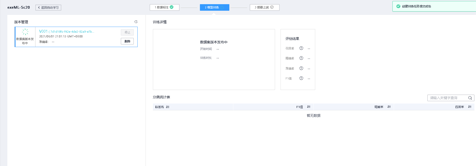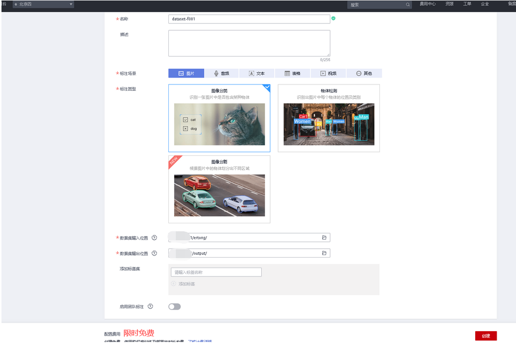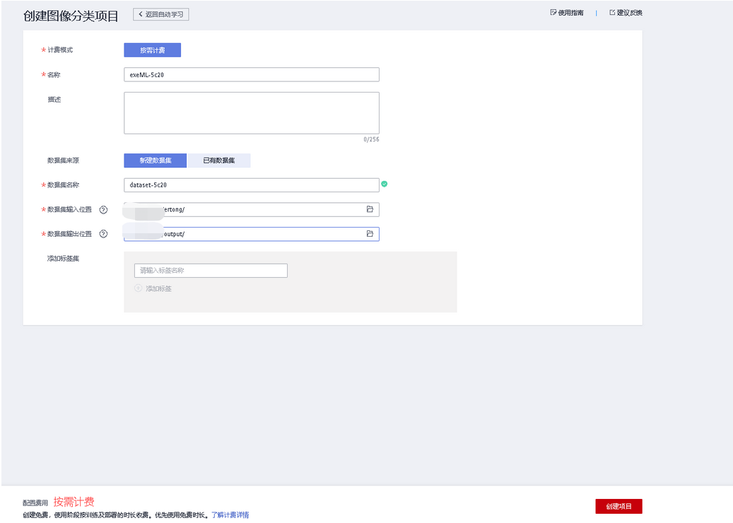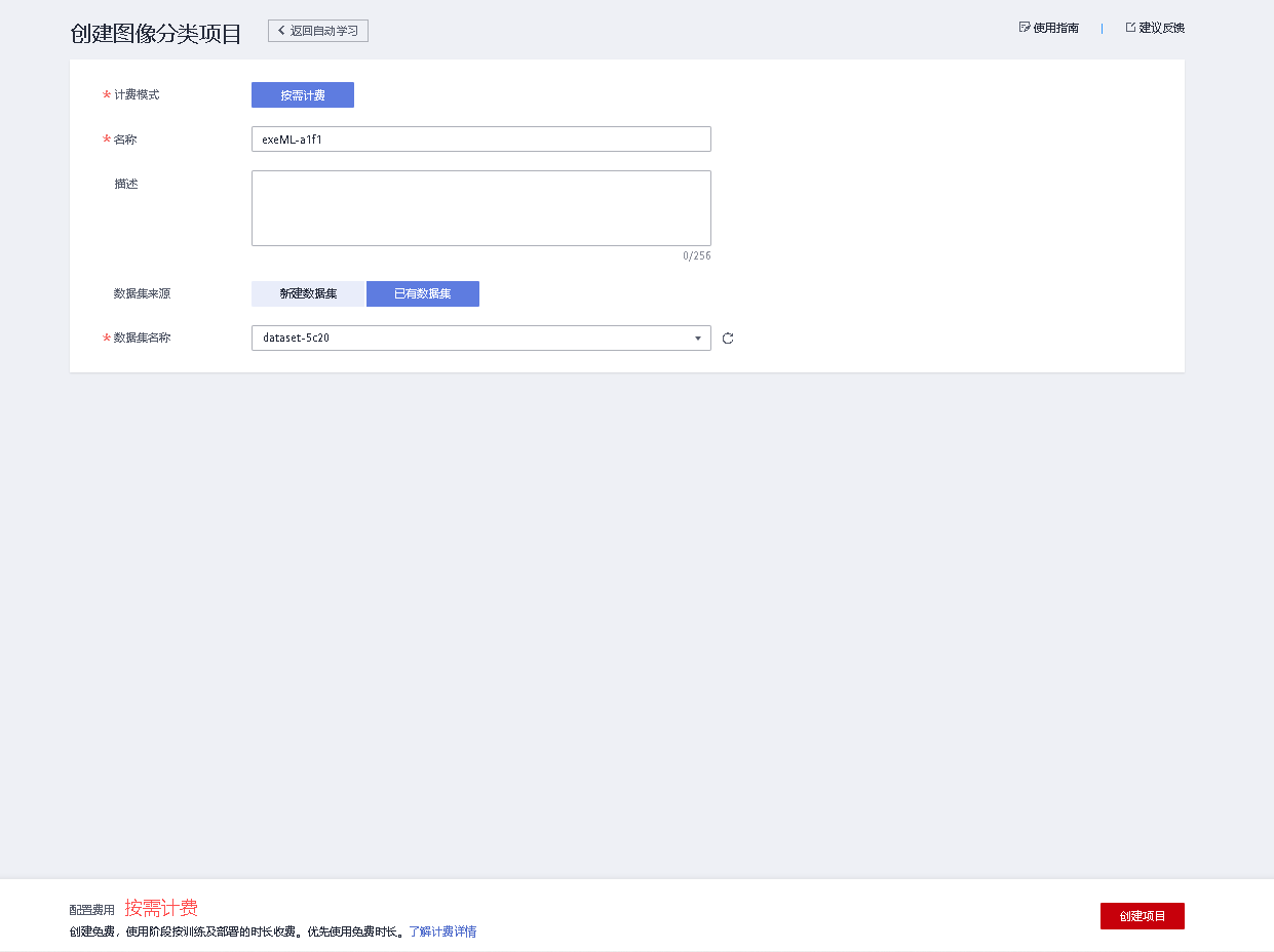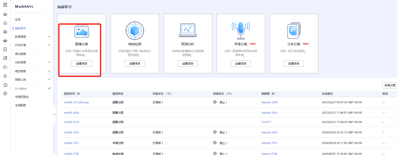 创建完数据集,创建自动学习的图像分类,点击已有数据集