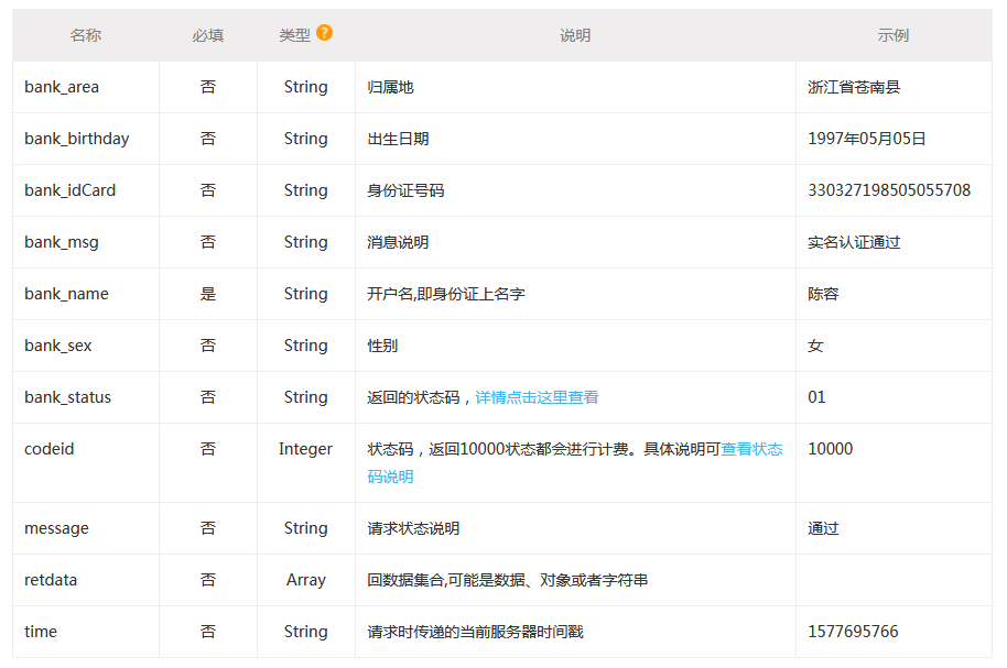 输入姓名、身份证号,校验此二要素是否一致,同时返回生日、性别、籍贯等信息;本接口为详细版本,可返回姓名不一致、号码不存在、核验一致。直连官方权威渠道, 精准核验,不限性别、不限年龄,不限民族,校验100%可靠;高准确率-实时查询零缓存,毫秒级响应, 准确率99.99%;高稳定性-多通道自动切换,保证业务不间断;专业服务-7*24小时服务,极速响应,为用户保驾护航。
