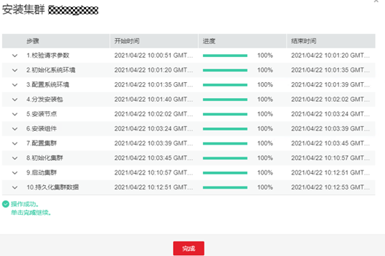 登录FusionInsight Manager管理界面, 使用创建集群功能,导入LLD生成的集群安装模板即可自动完成主机发现,集群参数设置等动作。检查集群参数无误后点击提交就进入了集群部署流程。
