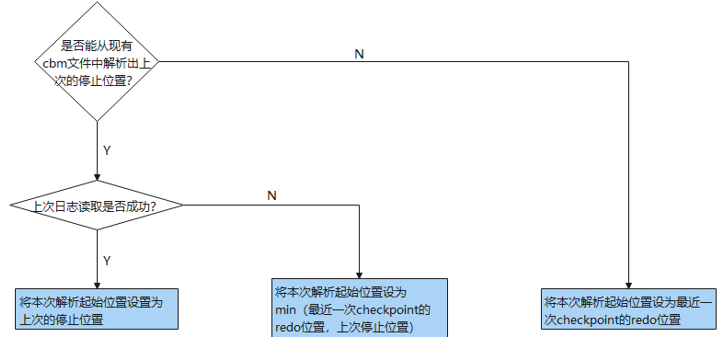 在startup线程刚启动时,其根据已经解析出来的cbm文件,来决定cbm writer开始解析的起始lsn位置。然后,每次执行到checkpoint末尾时,会设置cbm writer线程的latch。cbm writer线程一直在一个死循环中等待latch被设置,然后进行一轮日志解析。第一次解析时,由于Startup线程已经确定了解析起始的lsn位置,所以不需要强制初始化。如果解析失败,那么这次解析的截止lsn将作为下次解析的起始lsn,并且下一次解析之前不需要进行强制初始化;如果解析失败,那么下次解析前需要进行强制初始化,用于重新确定解析的起始位置。每次解析的截止位置为唤醒本次解析的checkpoint的redo位置。